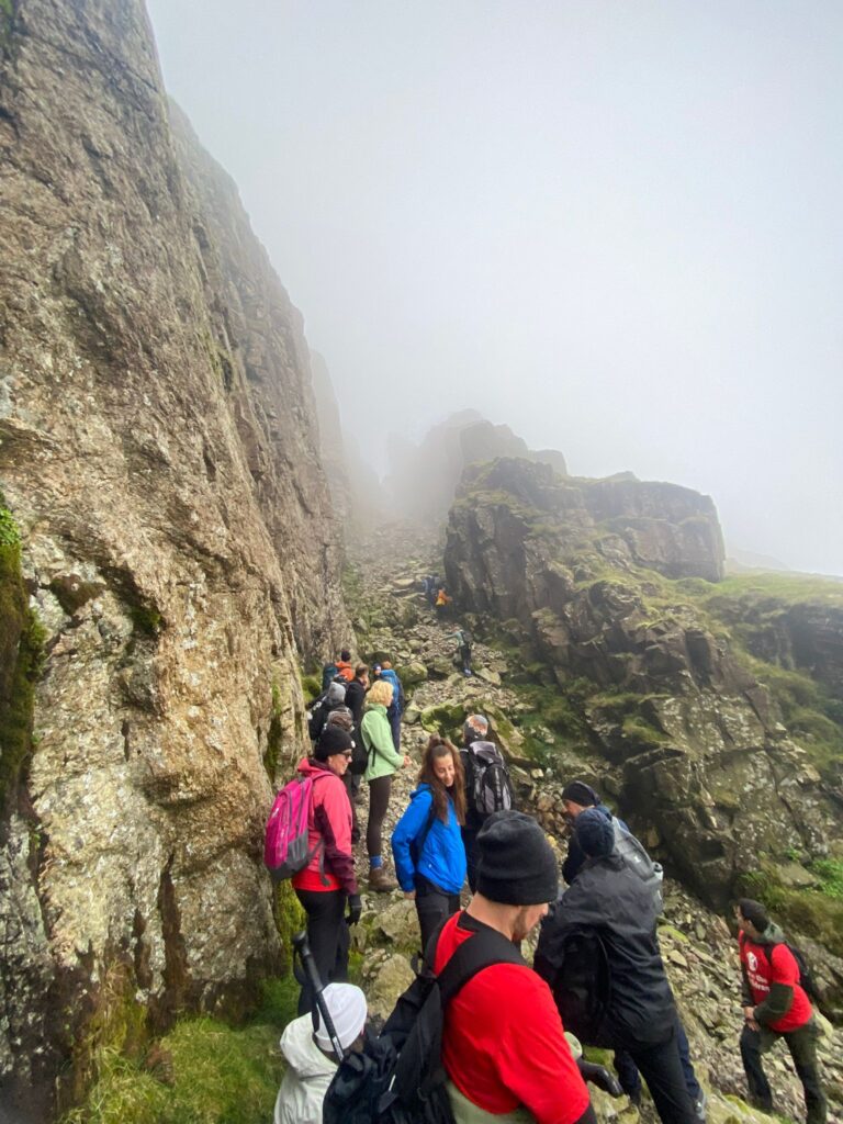 Led by their expert guide, Tim, the team decided to match their supporters’ passion and summited Scafell Pike as well as Scafell, Lord’s Rake, Fox’s Gulley and Mickledore. The nine hour route had them experience gale force winds and walking through thick fog, but despite the long route and the difficulty, the team persevered.