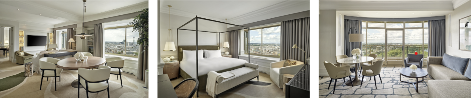 On the 27th floor, the design draws inspiration from the beauty of Hyde Park, with natural tones and equestrian themes. Guests in these suites can enjoy unparalleled views of the park, including the Household Cavalry Mounted Regiment rehearsals.