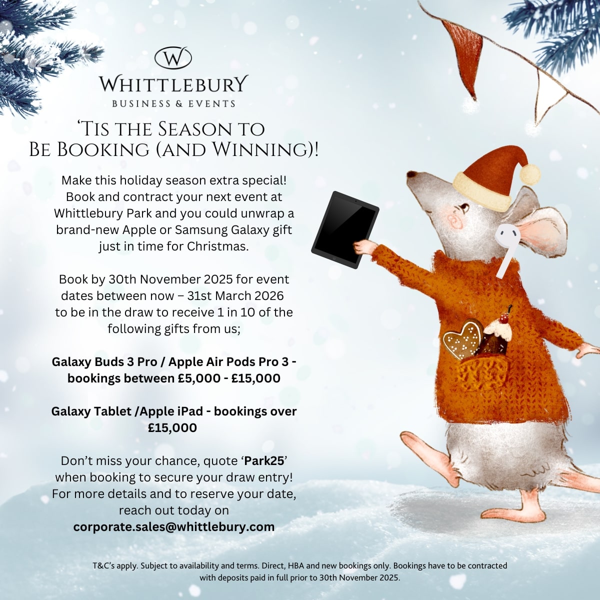 Book and contract your next event by 30th November 2025 for event dates up to 31st March 2026, and you could unwrap a brand-new Apple or Samsung Galaxy gift – just in time for Christmas!