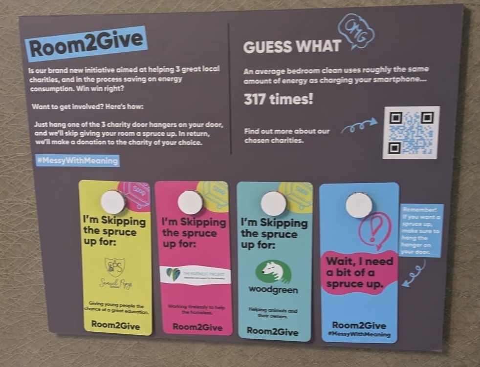Launched at Wyboston Lakes Resort in January 2025, Room2Give offers guests staying for more than one night the opportunity to choose to support one of three local charities instead of opting for a room clean. By displaying a colour coded door hanger, selecting their preferred charity a donation is made to the Room2Give fund.